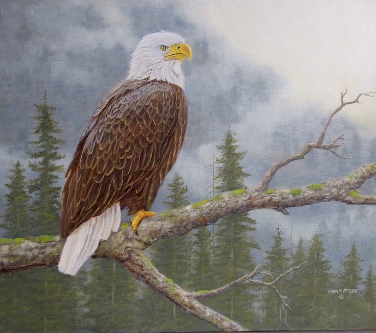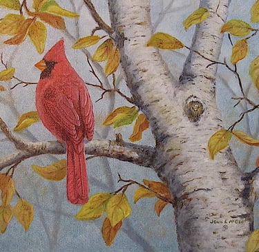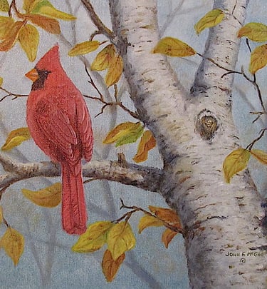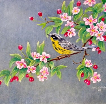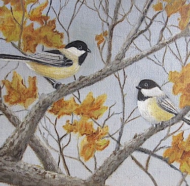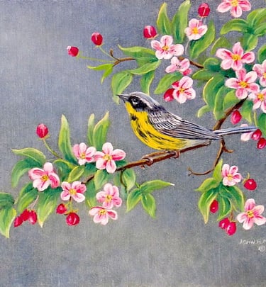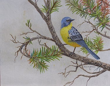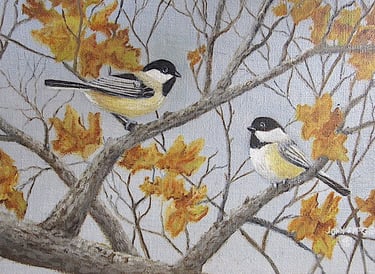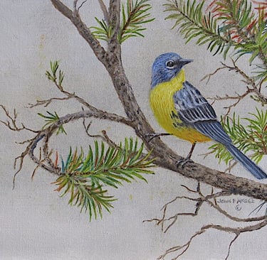 A vibrant abstract painting with bold strokes of blue and gold that captures dynamic movement.